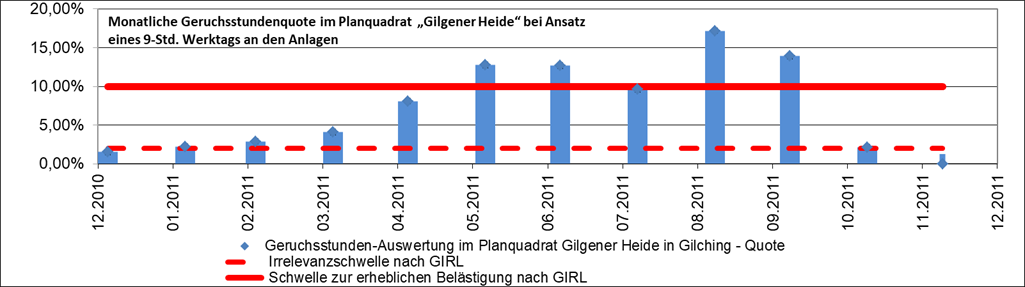 Die Irrelevanzgrenze liegt bei 2% Geruchsstunden (176 GStd.) , der Immissionsgrenzwert der Erheblichkeit ist bei 10% Geruchsstunden (876 GStd.) bezogen auf die Jahresstunden (8760 Std.) überschritten.
